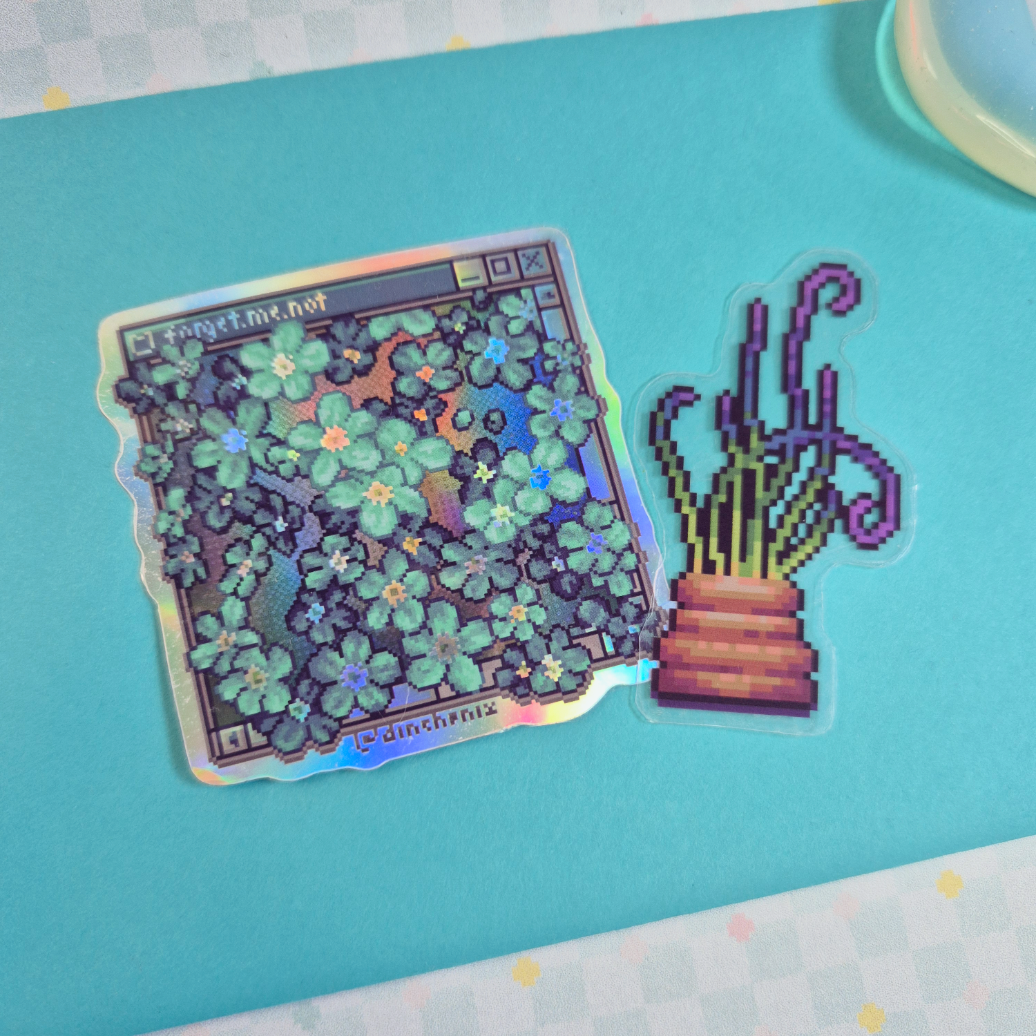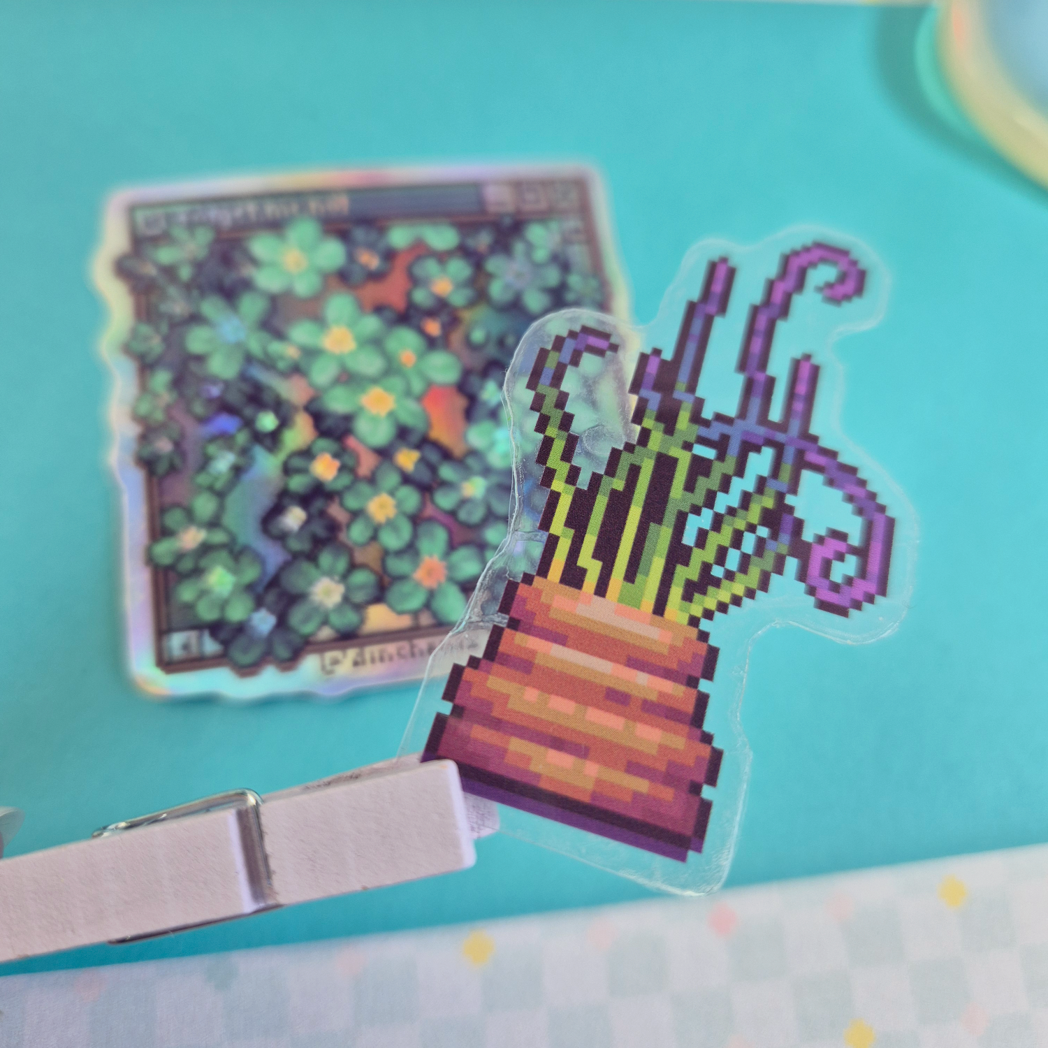 Clear and Holo Vinyl Sticker with Pixel Art Plant motive.